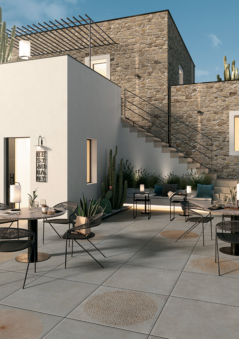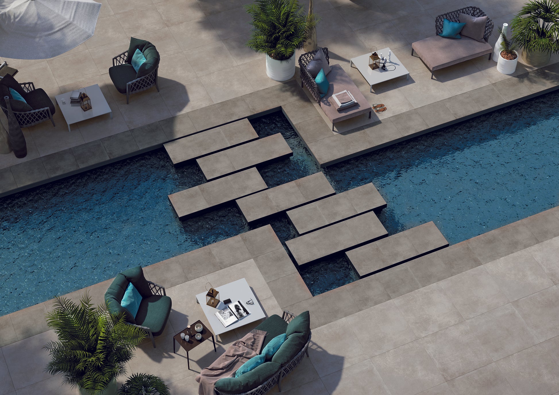 Keramikplatte in Betonoptik, Oberfläche strukturiert, Kanten leicht gefast