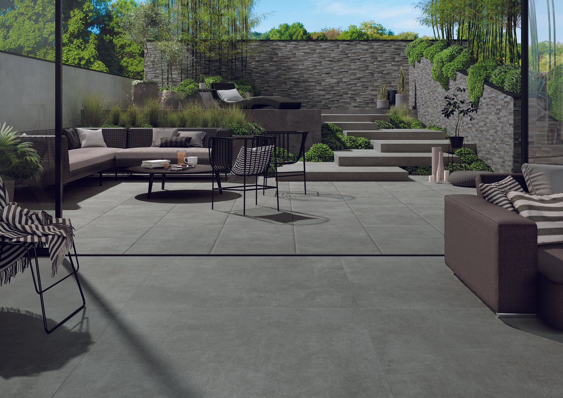 Keramikplatte in Betonoptik, Oberfläche strukturiert, Kanten leicht gefast