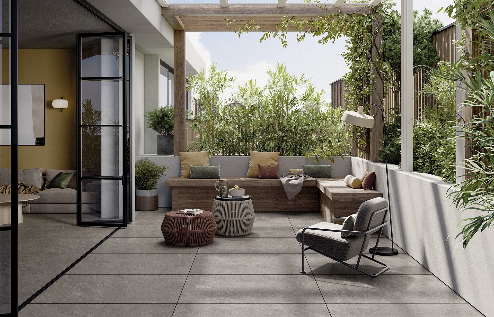 Keramikplatte in Naturstein/Marmoroptik, Oberfläche strukturiert, Kanten leicht gefast
